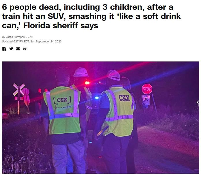 中新網(wǎng)9月25日電 據(jù)美國有線電視新聞網(wǎng)(CNN)24日報道,當(dāng)?shù)貢r間23日晚,美國佛羅里達州希爾斯伯勒縣一列火車在經(jīng)過鐵路口時與一輛SUV汽車相撞,造成6人遇難,其中包括3名兒童。