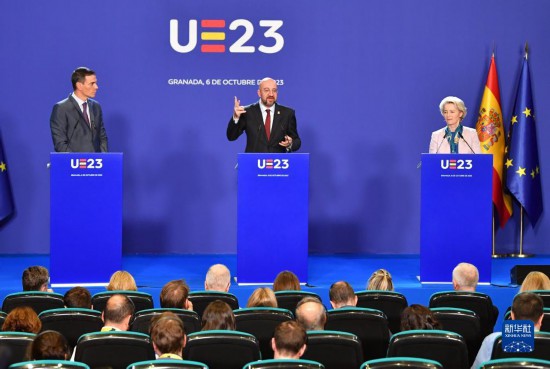 10月6日,在西班牙南部城市格拉納達,西班牙代理首相桑切斯(后左)、歐洲理事會主席米歇爾(后中)、歐盟委員會主席馮德萊恩(后右)在歐盟領(lǐng)導(dǎo)人非正式會議后出席新聞發(fā)布會。新華社記者連漪攝