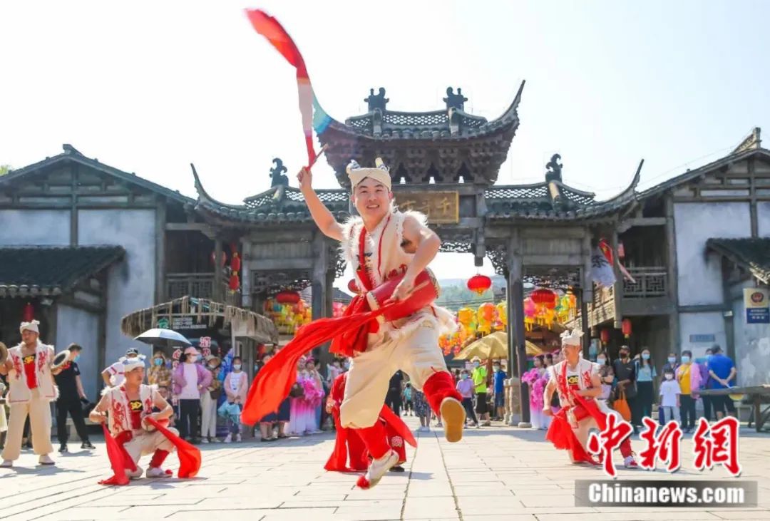 千華古村內(nèi)的“歡慶腰鼓”表演。鐘學(xué)滿 攝