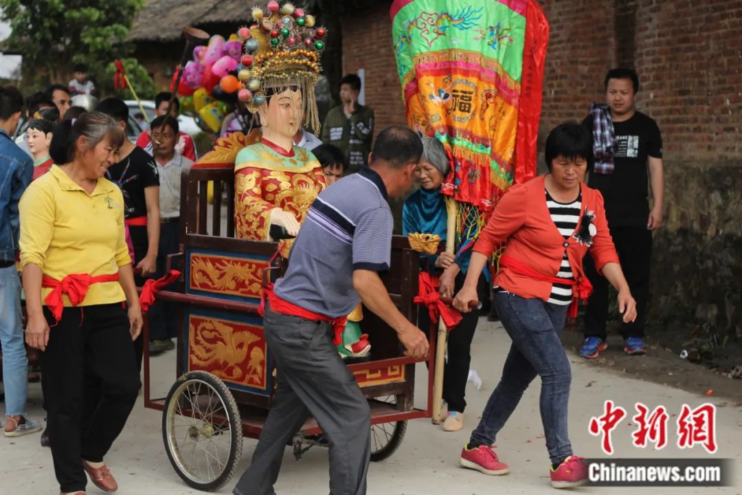 冼夫人(神像)在信眾的簇?fù)硐卵惨暠就?,為這里的人們帶來(lái)心靈的慰藉。蘇崢 攝