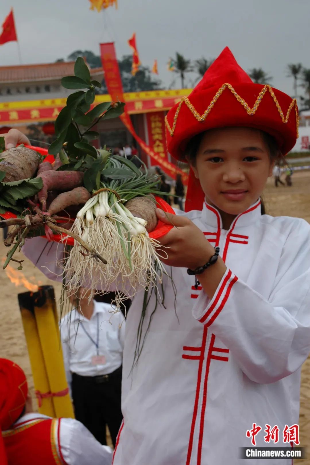 2023年2月28日,第二十二屆??谫蛉宋幕?jié)(原稱軍坡節(jié))之“裝軍巡游”活動(dòng)在海南海口新坡鎮(zhèn)舉行。圖為在活動(dòng)中肩挑花籃的小女孩。駱云飛 攝