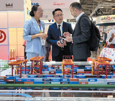 在2023年慕尼黑國際物流博覽會上,工作人員在中鐵集裝箱運輸有限公司展臺前向國外客戶介紹廣州國際港中歐班列站點設(shè)施。