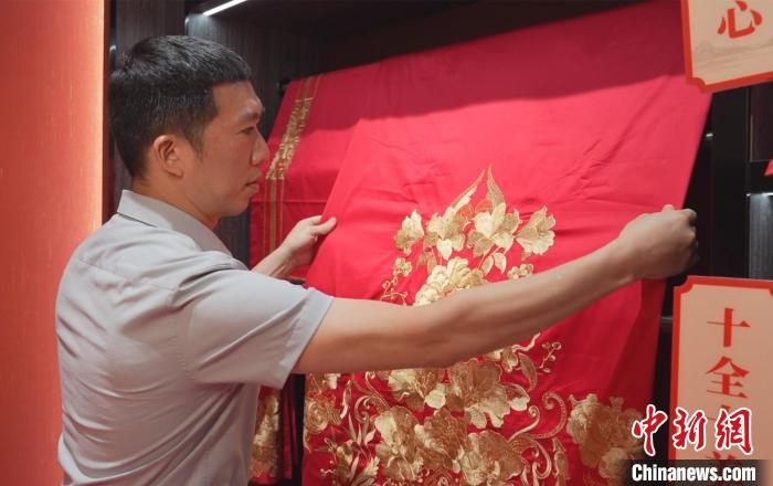 8月28日,“臺二代”、湖南富麗真金家紡有限公司總經(jīng)理杜俊毅在展廳整理產(chǎn)品?!钍篮?攝