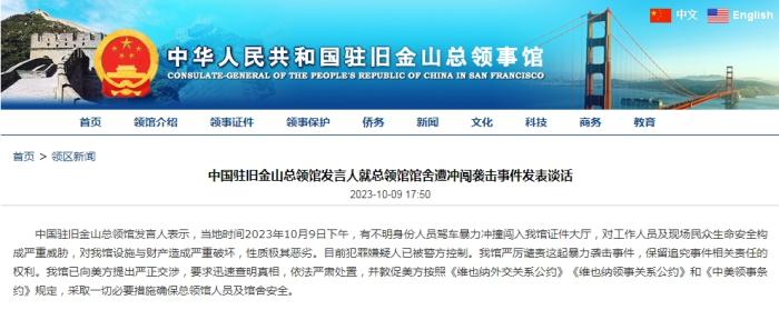 中新網(wǎng)10月10日電 據(jù)中國駐舊金山總領(lǐng)館網(wǎng)站消息,中國駐舊金山總領(lǐng)館發(fā)言人表示,當(dāng)?shù)貢r間2023年10月9日下午,有不明身份人員駕車暴力沖撞闖入中國駐舊金山總領(lǐng)館證件大廳,對工作人員及現(xiàn)場民眾生命安全構(gòu)成嚴(yán)重威脅,對中國駐舊金山總領(lǐng)館設(shè)施與財產(chǎn)造成嚴(yán)重破壞,性質(zhì)極其惡劣。