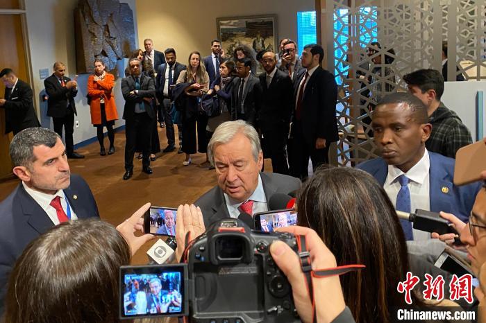 當(dāng)?shù)貢r間10月13日,聯(lián)合國秘書長古特雷斯在安理會就中東局勢進(jìn)行緊急磋商后,在紐約聯(lián)合國總部回答記者提問?!≈行律缬浾?王帆 攝