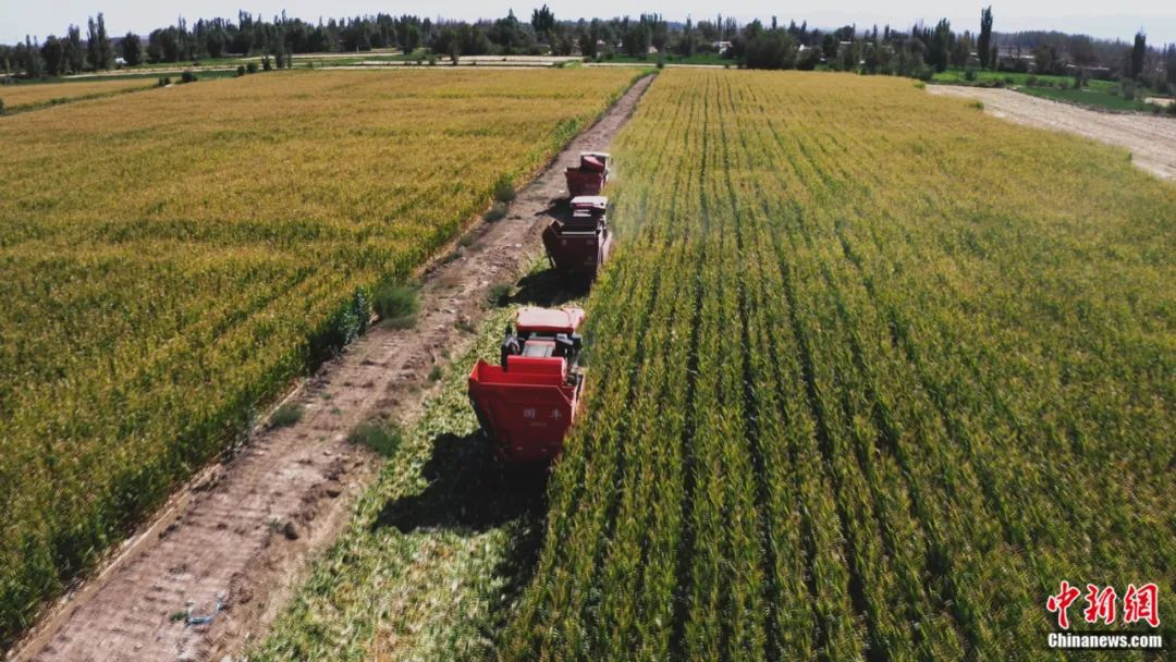 敦煌市莫高鎮(zhèn)新店臺村的高標(biāo)準農(nóng)田里,收割機在田地里收割玉米。郭均強 攝