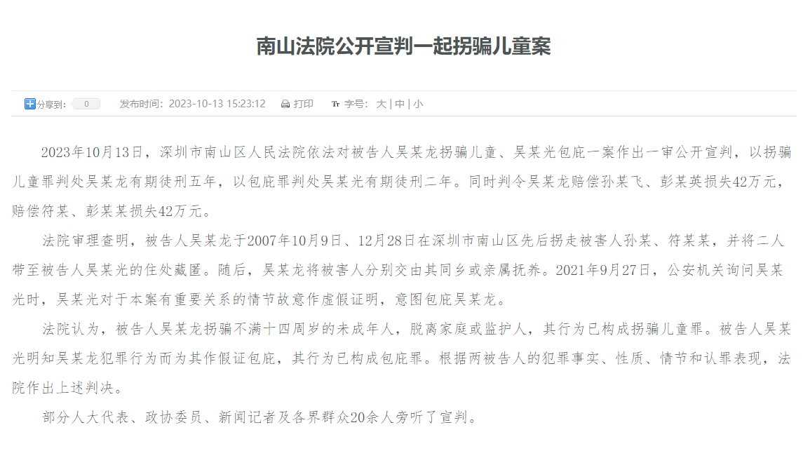 10月13日,深圳市南山區(qū)人民法院依法對(duì)被告人吳某龍拐騙兒童、吳某光包庇一案作出一審公開(kāi)宣判,以拐騙兒童罪判處吳某龍有期徒刑五年,以包庇罪判處吳某光有期徒刑二年。同時(shí)判令吳某龍賠償孫某飛、彭某英損失42萬(wàn)元,賠償符某、彭某某損失42萬(wàn)元。