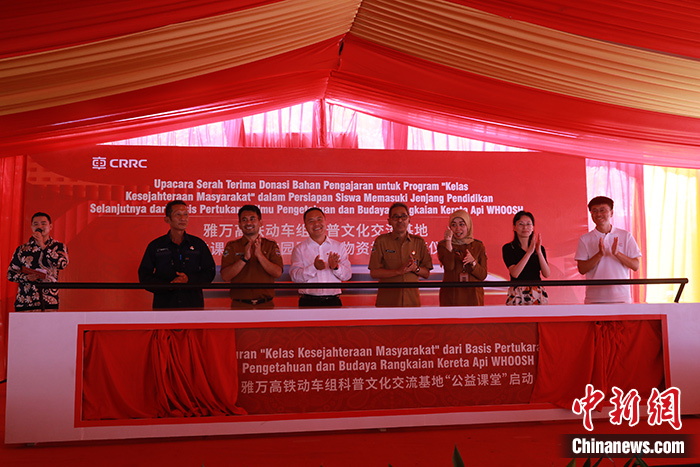 當?shù)貢r間10月24日,雅萬高鐵動車組科普文化交流基地公益課堂進校園暨教學(xué)物資捐贈交接儀式在印尼萬隆岸普拉第三國立初級中學(xué)舉行,這是中國高鐵公益課堂首次走進印尼校園。圖為儀式啟動現(xiàn)場。 中新社記者 李志全 攝