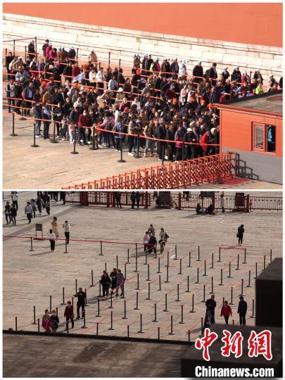 上圖為10月20日9時許,故宮博物院午門外檢票現(xiàn)場;下圖為10月19日13時許,故宮博物院午門外檢票現(xiàn)場。 故宮博物院供圖