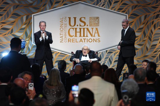 10月24日,美國前國務(wù)卿基辛格(中)出席在紐約舉行的美中關(guān)系全國委員會(huì)年度頒獎(jiǎng)晚宴。新華社記者李睿攝