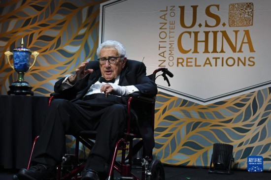 10月24日,美國前國務(wù)卿基辛格(中)在紐約舉行的美中關(guān)系全國委員會(huì)年度頒獎(jiǎng)晚宴上講話。新華社記者李睿攝