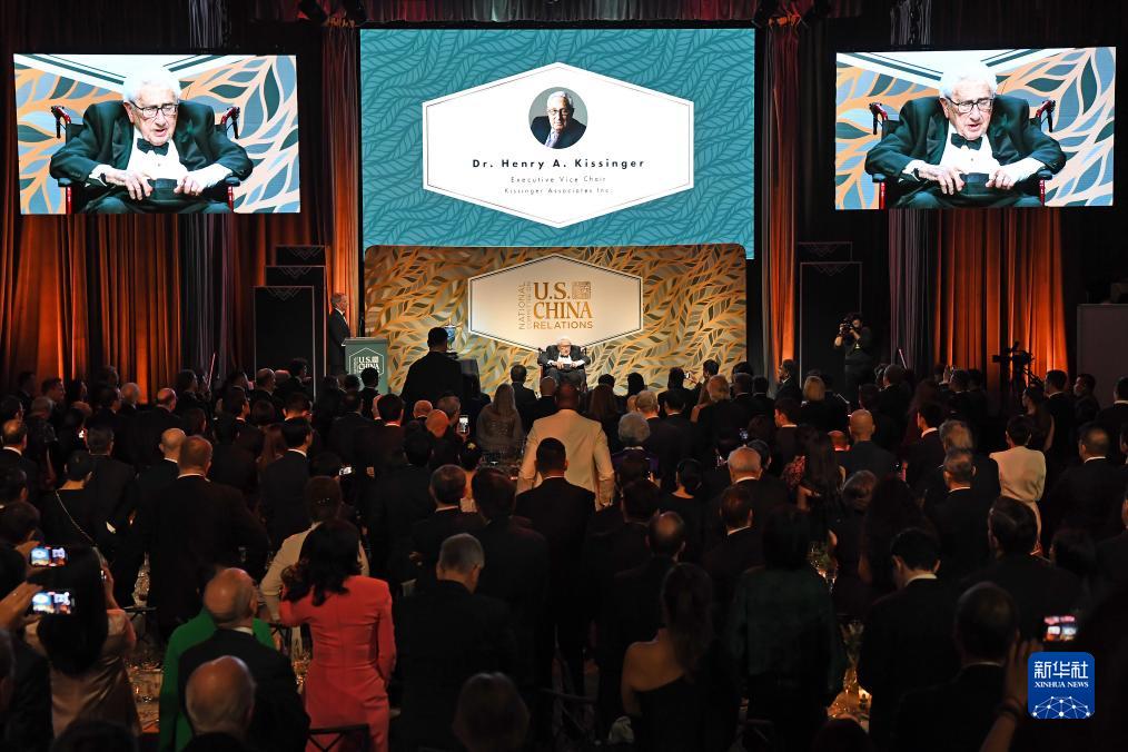 10月24日,美國(guó)前國(guó)務(wù)卿基辛格(中)在紐約舉行的美中關(guān)系全國(guó)委員會(huì)年度頒獎(jiǎng)晚宴上講話。新華社記者 李睿 攝