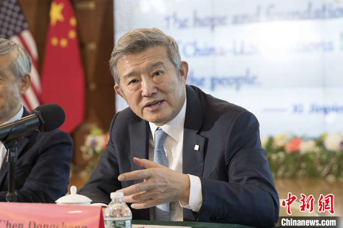 當?shù)貢r間10月25日,參加清華大學和美中關系全國委員會共同舉辦的“中美民眾對話”活動的部分代表來到中國駐紐約總領事館,就中美經(jīng)貿(mào)關系、科研合作、人文交流等回答記者提問。被問及中國企業(yè)在美國投資的相關問題時,泰康保險集團董事長陳東升表示,貿(mào)易和投資對中美關系十分重要。在美國投資,比如康復醫(yī)療是一個大的合作方向,我們歡迎美國的企業(yè)來合作,這是互利互惠的過程。 中新社記者 廖攀 攝
