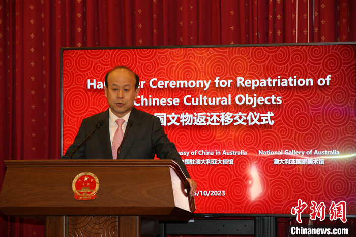 當?shù)貢r間10月25日上午,經(jīng)中國國家文物局授權,中國駐澳大利亞大使館在堪培拉舉行儀式,接收澳方向中國返還共4件流失文物藝術品與1件古生物化石。中國駐澳大利亞大使肖千在致辭中表示,這些文物回歸祖國,顯示了中澳兩國政府對于保護文化遺產(chǎn)的共同承諾,是雙方文化遺產(chǎn)交流的一次盛事和友好合作的見證。 中新社記者 顧時宏 攝