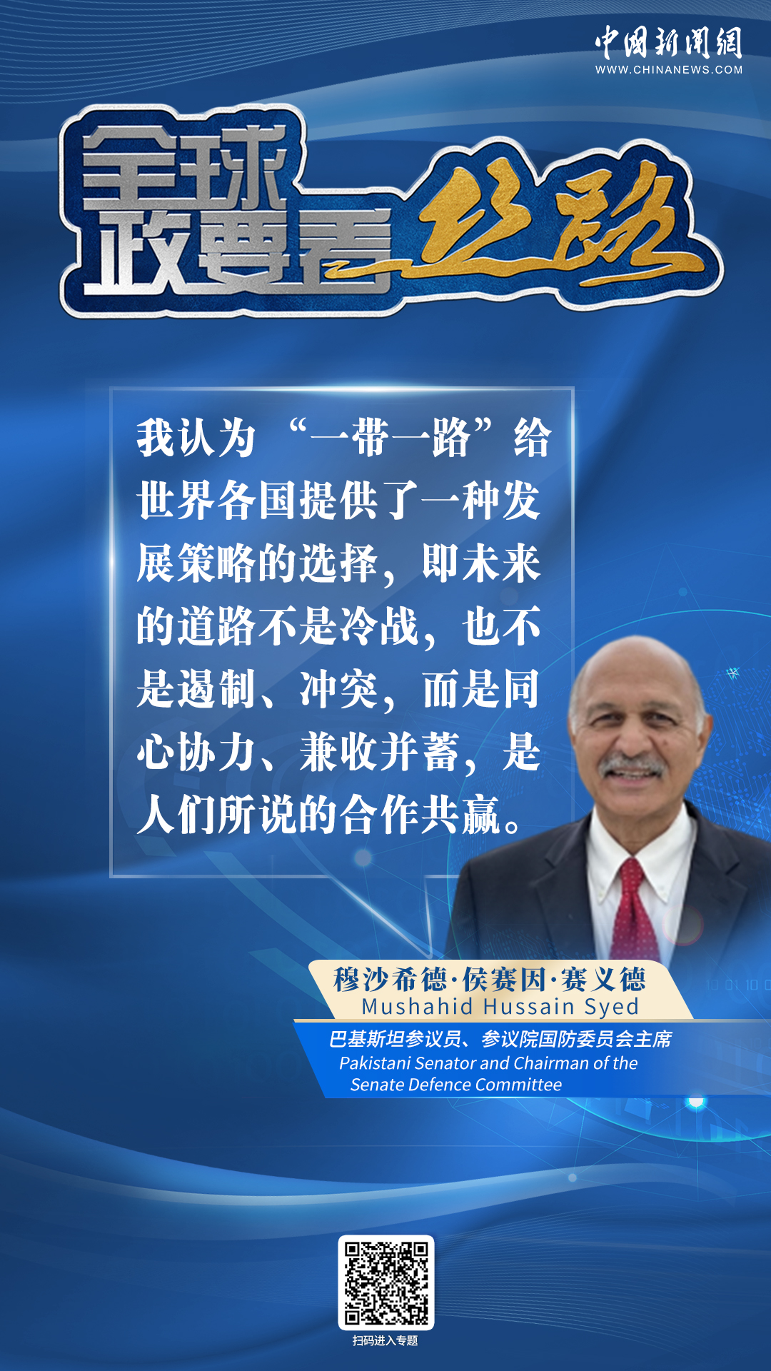 中新網(wǎng)10月28日電(張乃月) “‘一帶一路’給世界各國(guó)提供了一種發(fā)展策略的選擇,即未來(lái)的道路不是冷戰(zhàn),也不是遏制、沖突,而是同心協(xié)力、兼收并蓄,是人們所說(shuō)的合作共贏?!卑突固箙⒆h員、參議院國(guó)防委員會(huì)主席穆沙希德·侯賽因·賽義德近日接受中新網(wǎng)專訪時(shí)如是說(shuō)。