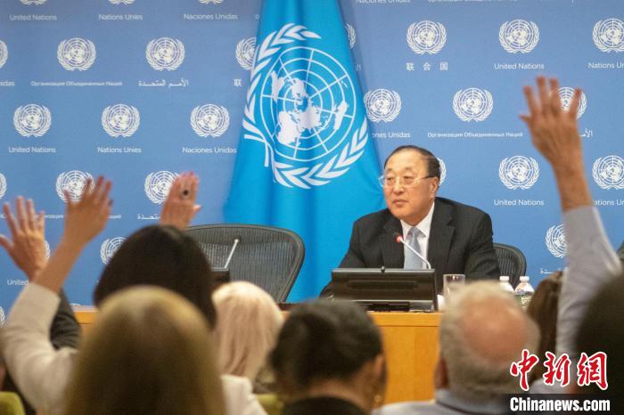 當?shù)貢r間11月1日,中國常駐聯(lián)合國代表張軍在紐約聯(lián)合國總部向媒體吹風,介紹中方擔任安理會輪值主席的工作考慮。圖為現(xiàn)場媒體舉手提問。中新社記者 王帆 攝