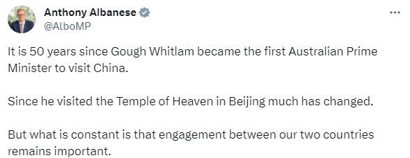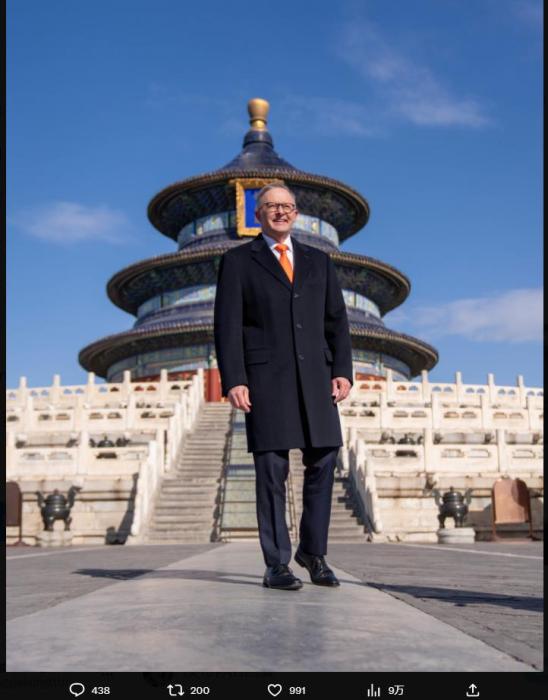 阿爾巴尼斯在社交媒體上發(fā)布了多張參觀天壇的照片,并發(fā)文稱,“50年前,高夫·惠特拉姆成為首位訪華的澳大利亞總理。自從他參觀北京的天壇以來,已經(jīng)發(fā)生了很大變化。但不變的是,我們兩國(guó)之間的接觸仍然很重要?!?/p>
