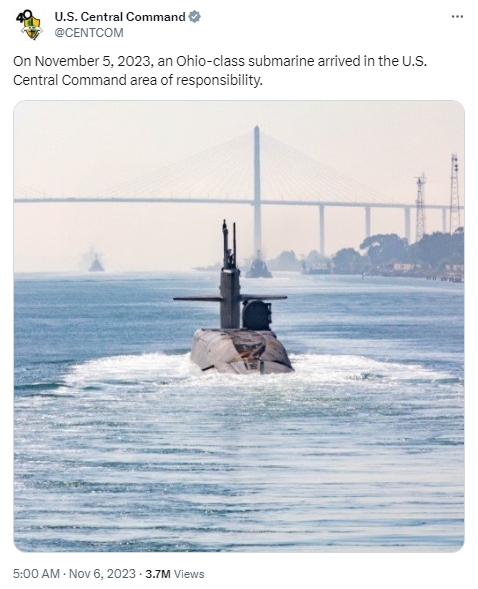 據(jù)報(bào)道,當(dāng)天,美國中央司令部在社交媒體上發(fā)帖稱,“11月5日,一艘‘俄亥俄’級戰(zhàn)略潛艇抵達(dá)中東地區(qū)?!?/p>