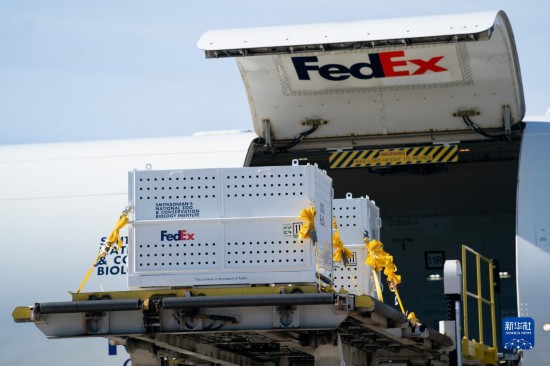 11月8日,運送大熊貓的專機從美國弗吉尼亞州的華盛頓杜勒斯國際機場起飛。新華社記者劉杰攝