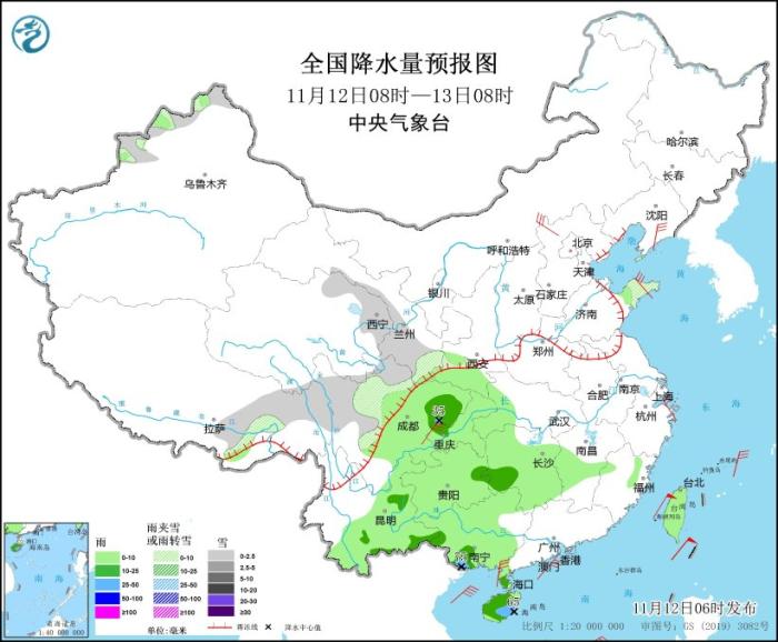 全國降水量預(yù)報(bào)圖(11月12日08時(shí)-13日08時(shí))