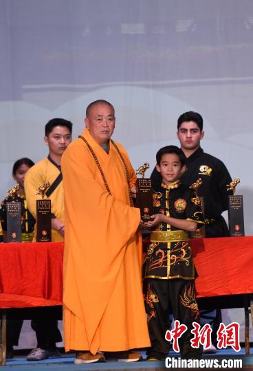 當(dāng)?shù)貢r間11月12日下午,由中國嵩山少林寺主辦的“不朽少林”少林功夫公演在已有逾百年歷史的美國洛杉磯Million Dollar劇院舉行。圖為嵩山少林寺方丈釋永信向“北美洲少林考功大賽”獲獎?wù)哳C獎?!≈行律缬浾? 張朔 攝