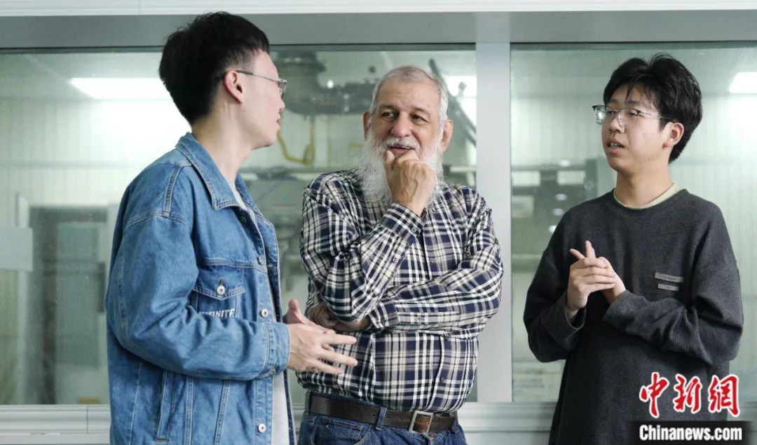 2023年11月,利用實(shí)驗(yàn)室午間休憩間隙,裴德樂(lè)在電子科技大學(xué)接受了中新社“東西問(wèn)”采訪。身著紅色衛(wèi)衣、藍(lán)色牛仔褲的裴德樂(lè)精神矍鑠,言語(yǔ)間中氣十足。