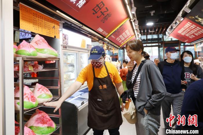 正式開張首日,各攤商早早地布置好店面。記者在市場一樓看到,立家湖州粽店的粽子等美食香氣四溢,購買民眾排起長隊;合興糕團店的巨大壽桃上有“福”“祿”“生日快樂”等字,吸引顧客拍照;大連食品店整齊擺著各類堅果,并掛著湖南臘腸、廣東臘肉等熟食。
