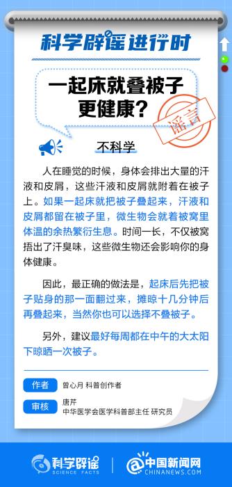 中新網11月17日電 人在睡覺的時候,身體會排出大量的汗液和皮屑,這些汗液和皮屑就附著在被子上。如果一起床就把被子疊起來,汗液和皮屑都留在被子里,微生物會就著被窩里體溫的余熱繁衍生息。時間一長,不僅被窩捂出了汗臭味,這些微生物還會影響你的身體健康。(來源:@科學辟謠 @中國新聞網 )