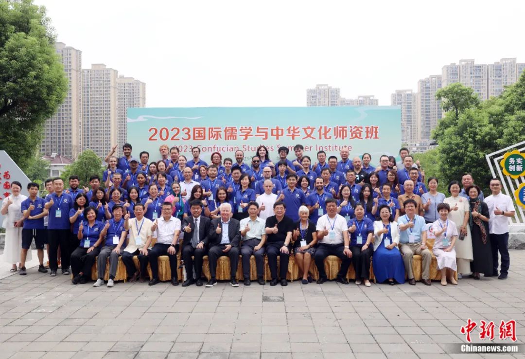 2023年8月14日,與會(huì)嘉賓和學(xué)院在活動(dòng)現(xiàn)場(chǎng)合影。當(dāng)日,由北京外國(guó)語(yǔ)大學(xué)與國(guó)際儒學(xué)聯(lián)合會(huì)聯(lián)合主辦的“2023國(guó)際儒學(xué)與中華文化師資班”開班儀式在江蘇省丹陽(yáng)市舉行,來(lái)自20多個(gè)國(guó)家和地區(qū)的120名學(xué)員,參加為期13天的中華傳統(tǒng)文化研修。李國(guó)慶 攝