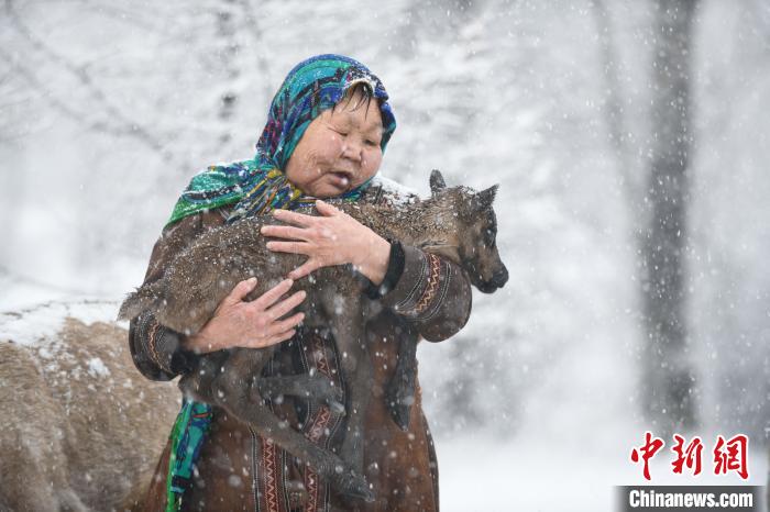 資料圖。圖為2023年4月29日,在內(nèi)蒙古大興安嶺,柳霞在雪中懷抱一頭剛出生不久的馴鹿幼崽。 王偉 攝