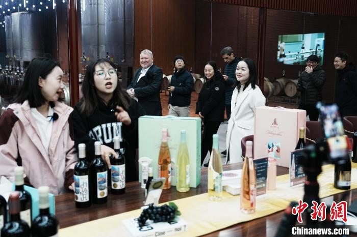 澳大利亞駐華大使館公使銜參贊樊思明(左三)被賀蘭神酒莊工作人員直播帶貨的場(chǎng)景吸引。中新網(wǎng)記者 崔楠 攝