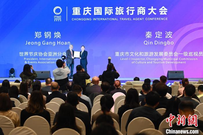 世界節(jié)慶協(xié)會(huì)亞洲分會(huì)會(huì)長(zhǎng)鄭鋼煥為重慶市頒發(fā)“2023亞太旅游節(jié)慶城市”獎(jiǎng)。中新網(wǎng)記者何蓬磊攝