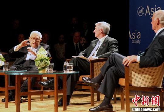 資料圖:美國前國務(wù)卿亨利·基辛格(左)與前國務(wù)卿詹姆斯·貝克等人進(jìn)行有關(guān)美中關(guān)系的對(duì)話。中新社發(fā) 王歡 攝