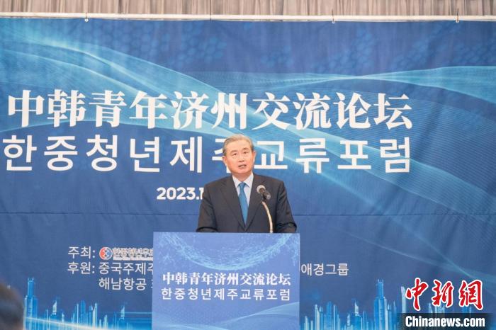 11月30日,中韓青年濟(jì)州交流論壇在韓國濟(jì)州舉行。圖為中國駐濟(jì)州總領(lǐng)事王魯新致賀詞。韓中青年友好協(xié)會(huì) 供圖