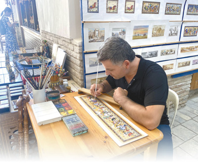 一名畫師在布哈拉一處集市內創(chuàng)作有關古絲綢之路的畫作。