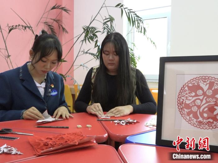 蘇慧娜與中國(guó)學(xué)生一同剪紙。呂盛楠攝