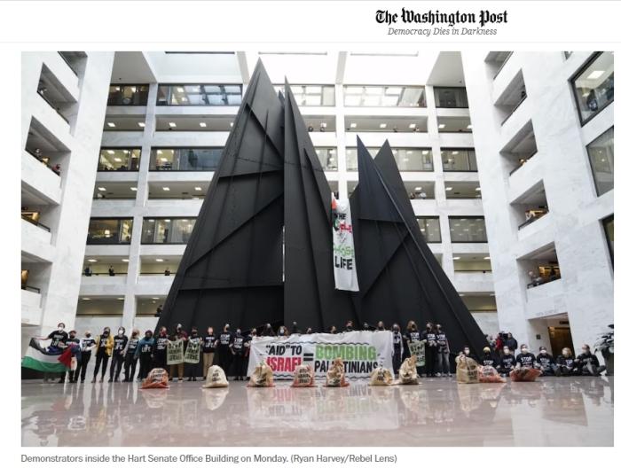 報(bào)道稱,抗議者身穿寫有“立即停止(援助)武器”字樣的黑色T恤,高喊“立即停火!立即?;?!”。他們還舉著寫有“援助以色列=轟炸巴勒斯坦人”的條幅。