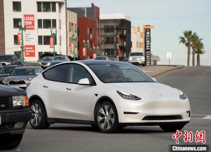 當?shù)貢r間12月13日,特斯拉電動汽車駛過美國加州圣馬特奧縣一處路口?!≈行律缬浾?劉關(guān)關(guān) 攝