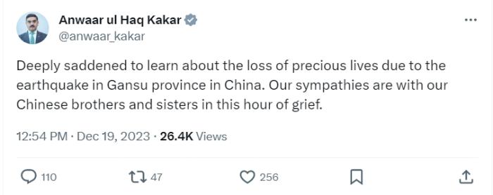 中新網(wǎng)12月19日電 綜合報(bào)道,12月18日,甘肅臨夏州積石山縣發(fā)生6.2級(jí)地震。19日,巴基斯坦總理卡卡爾在社交平臺(tái)上發(fā)帖稱,對(duì)中國甘肅省地震中失去的寶貴生命深感悲痛。