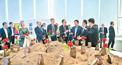 外國駐華使節(jié)和外交官在深圳南山能源生態(tài)園內(nèi)的科普教育基地參觀藝術(shù)作品《巖石里的花》。