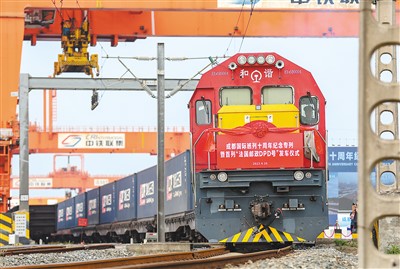 4月26日,成都國際班列十周年紀念專列暨首列“法國郵政DPD號”發(fā)車儀式在成都國際鐵路港舉行。