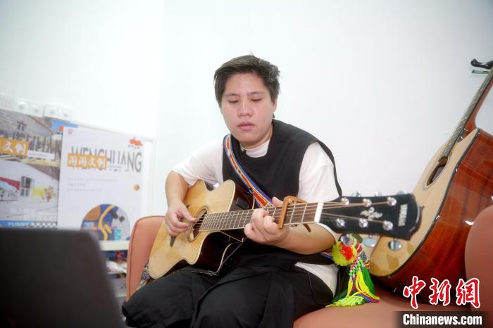 圖為賴淑珍邊彈吉他邊哼唱著歌曲《青青之約》?!≈行律缬浾?李思源 攝