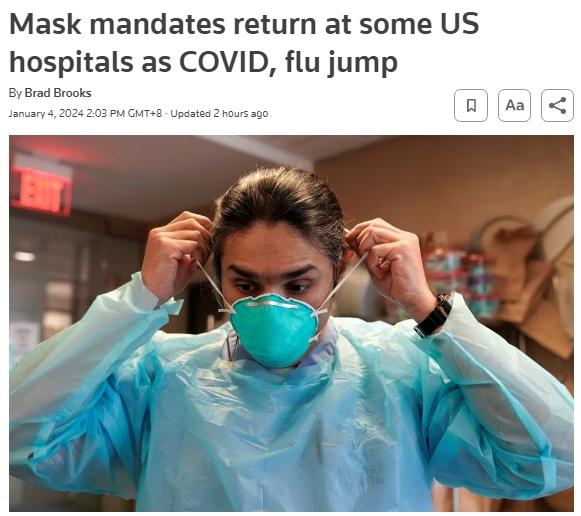 中新網(wǎng)1月4日電 據(jù)路透社當(dāng)?shù)貢r間3日報道,由于新冠病毒和季節(jié)性流感等呼吸道疾病病例激增,美國至少有四個州的醫(yī)院重啟“口罩令”。紐約州、加利福尼亞州、伊利諾伊州和馬薩諸塞州的醫(yī)療衛(wèi)生機構(gòu)恢復(fù)要求醫(yī)護人員和病患戴口罩的規(guī)定。