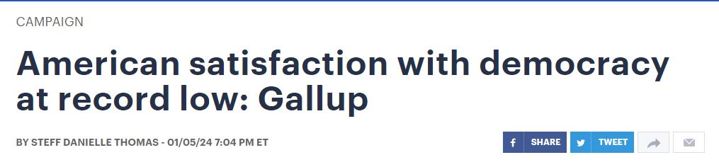 這項(xiàng)民調(diào)結(jié)果公布之時(shí),正值“國(guó)會(huì)山騷亂”事件三周年之際,美國(guó)也迎來新的選舉年?!秶?guó)會(huì)山報(bào)》網(wǎng)站在6日的報(bào)道中再次提到,目前美國(guó)出現(xiàn)了一系列與民主狀況有關(guān)的令人不安的跡象。
