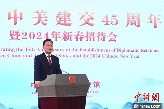 當(dāng)?shù)貢r間1月16日,中國駐美大使謝鋒在華盛頓舉辦的紀(jì)念中美建交45周年暨新春招待會上致辭。中新社記者 陳孟統(tǒng) 攝