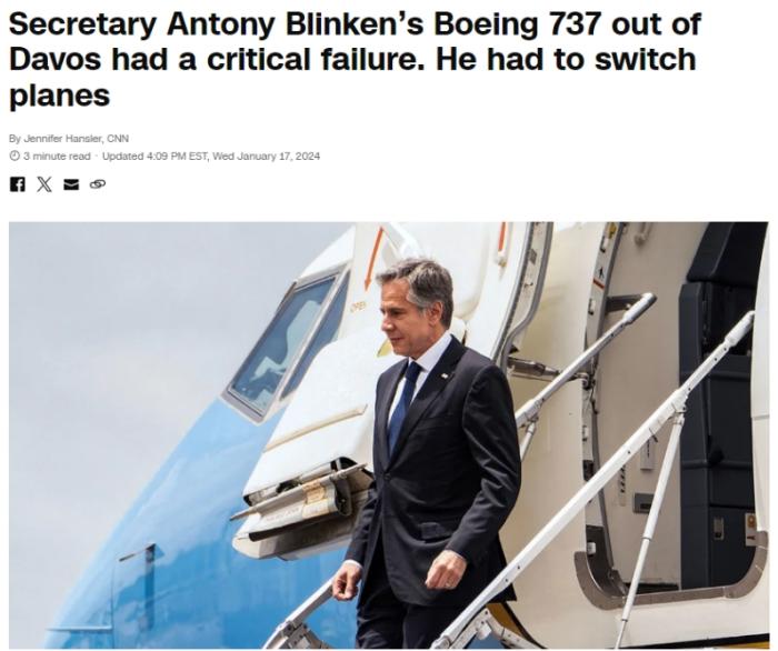 中新網(wǎng)1月18日電 據(jù)美國有線電視新聞網(wǎng)(CNN)報(bào)道,當(dāng)?shù)貢r(shí)間1月17日,美國國務(wù)卿布林肯參加完達(dá)沃斯論壇從瑞士蘇黎世返程時(shí),其乘坐的波音737飛機(jī)出現(xiàn)“嚴(yán)重故障”。