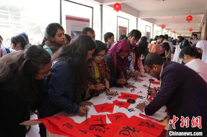 活動現(xiàn)場設(shè)置春節(jié)習(xí)俗展示、春節(jié)美食品鑒、書法年畫傳習(xí)館、非遺展演、新春(漢服)照像館、春節(jié)詩詞會、年宵花DIY互動體驗等10余項活動,讓孟加拉國民眾親身領(lǐng)略云南七彩的民族文化,和中國豐富多彩的春節(jié)民俗。