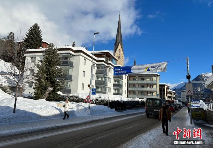 資料圖:當?shù)貢r間1月15日,達沃斯街道上掛起會議相關(guān)景觀裝飾。