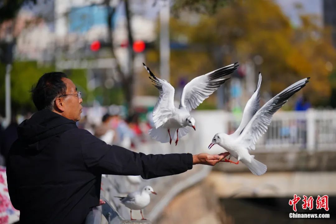 云南昆明市民在大觀河邊喂紅嘴鷗。劉冉陽 攝