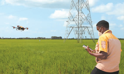 在烏干達卡隆古區(qū)盧卡亞鎮(zhèn)中億農業(yè)園,作業(yè)員赫伯特·阿加巴操控植保無人機噴灑農藥。